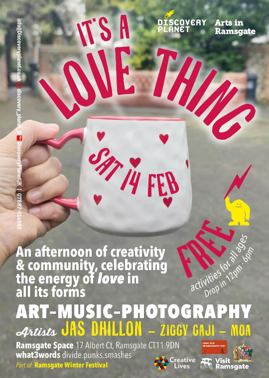 There will be Art workshops ‘It’s a Love Thing’ hosted by Arts in Ramsgate and Discovery Planet.
